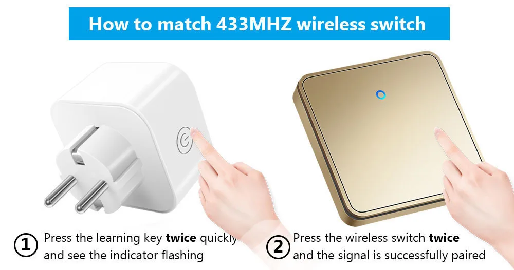 1. Пресс сопряжения сигнала ключ дважды, красный индикатор светильник включен, 2. Прикоснитесь к беспроводному переключателю 2 раза 3. Сигнал сопряжения успешно