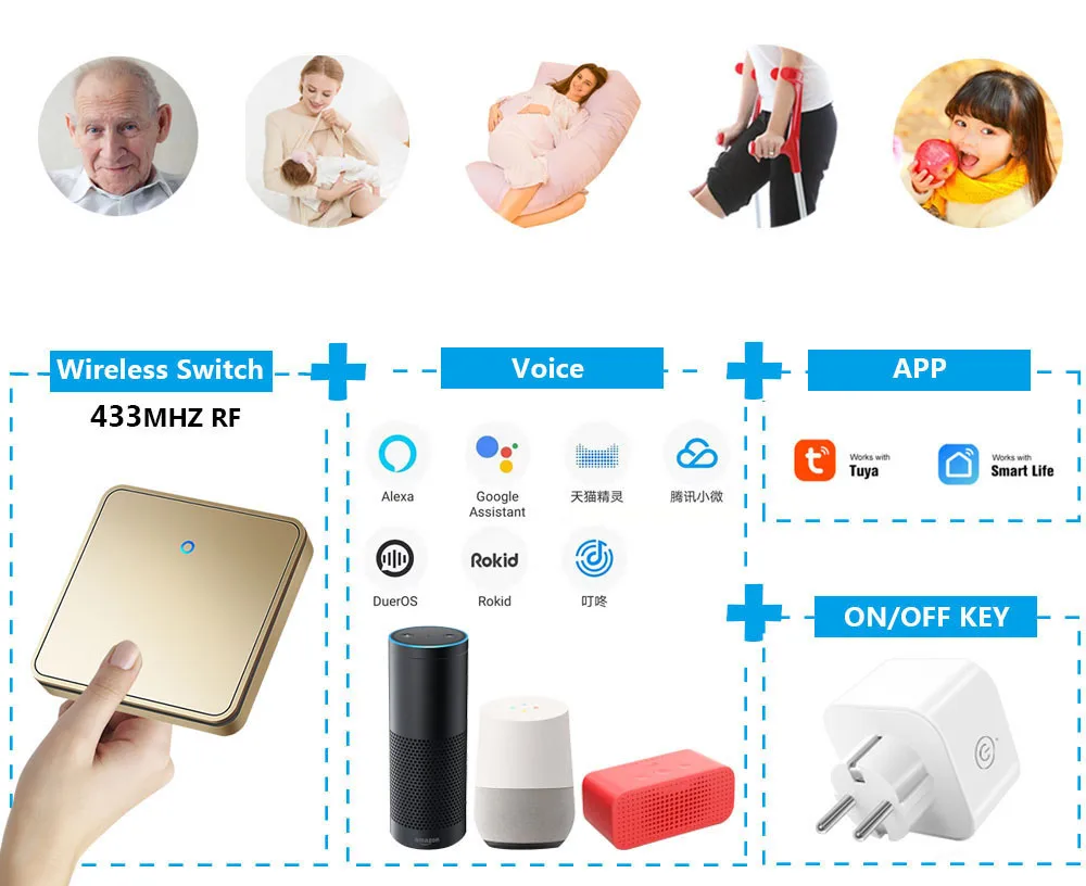 433 МГц RF + Голосовое управление + управление приложением + Кнопка ВКЛ/ВЫКЛ Особенно подходит для пожилых людей, кормящих матерей, беременных женщин, людей с ограниченными возможностями, детей и т. д.