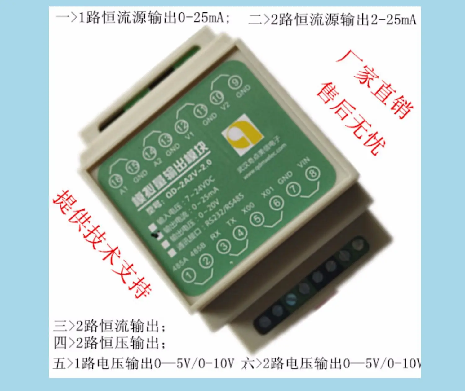 1. Этот продукт может контролировать 2-х канальный 0-25ma постоянный ток на выходе и 2-х канальный 0-5 вольт постоянного тока (или 0-10v) постоянное напряжение на выходе через RS232 или RS485 коммуникации, И точность тока и напряжения лучше, чем 0.5%.