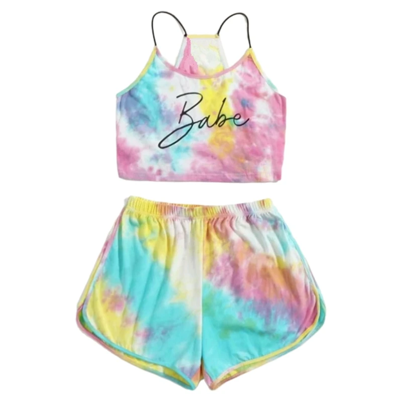Женский летний комплект одежды из 2 предметов с надписью «Tie-Dye», градиентный неоновый Радужный топ на бретельках, шорты с дельфинами, спортивный костюм, Пляжная уличная одежда