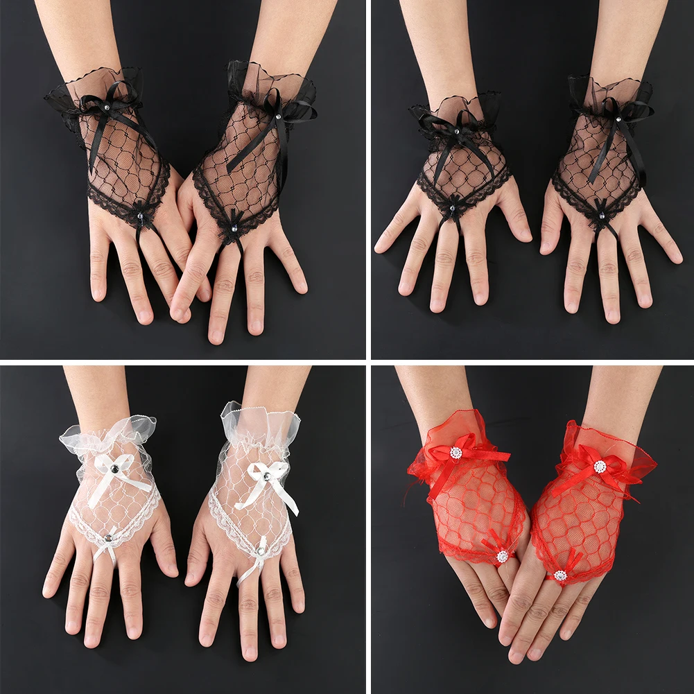 Красивые короткие перчатки без пальцев, украшенные милым бантом.