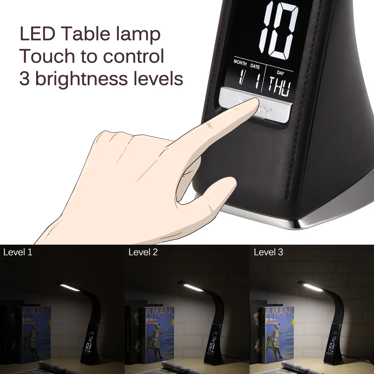 5 Вт современный светодиодный Настольный светильник в кожаном стиле со встроенным будильником, календарем, индикацией времени и температуры, регулируемым в 3 уровнях яркости.