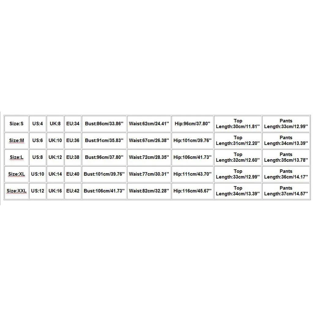 Размер США Великобритания ЕС Бюст Талия Бедра Длина верха Длина брюк S 4 8 34 86 см/33,86'' 62 см/24,41'' 96 см/37,80'' 30 см/11,81'' 33 см/12,99 дюйма М 6 10 36 91 см/35,83'' 67 см/26,38'' 101 см/39,76'' 31 см/12,20'' 34 см/13,39'' L 8 12 38 96 см/37,80'' 72 см/28,35'' 106 см/41,73'' 32 см/12,60'' 35 см/13,78'' XL 10 14 40 101 см/39,76'' 77 см/30,31'' 111 см/43,70'' 33 см/12,99 дюйма 36 см/14,17'' XXL 12 16 42 106 см/41,73'' 82 см/32,28'' 116 см/45,67'' 34 см/13,39'' 37 см/14,57''
