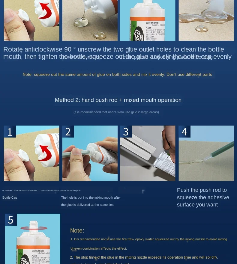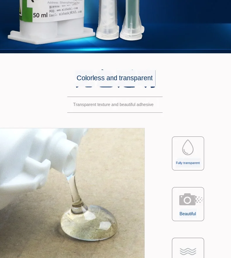 Название:Клей AB из эпоксидной смолыНомер модели:1060.Спецификация:50 мл.Цвет:Бесцветный и прозрачный.Термостойкость:-40 °C-90 °C.Вязкость:15000mpas.Область применения:Металл, керамика, пластик, стекло, дерево, камень и так далее.Информация о продукте:Этот клей AB из эпоксидной смолы, прочное отверждение в течение 60 минут, имеет характеристики долгосрочного адгезии, прозрачное отсутствие следов, сильное склеивание, водонепроницаемость и антикоррозию.1. Бесцветная прозрачная, прозрачная текстура, красивое соединение, не оставляющее следов.2. Жесткий и липкий, прочный и надежный.3. Широкий спектр применения: Автозапчасти, сборка электронных и электрических устройств, промышленное применение, производство изделий ручной работы и так далее.4. Устойчив к коррозии и высокой температуре. Антикоррозийная и антивозрастная после отверждения, может выдерживать температуру-40 °C-90 °C.5.AB Клей смешанный клей, Отличная адгезия. Стекло, дерево, камень, металл, ювелирные изделия, керамика, игрушки, изделия ручной работы и другие материалы подходят.Детальный рисунок продукта: