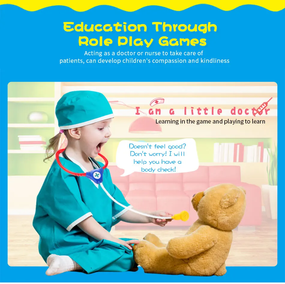 Имитирует процесс посещения врачом пациента, дети могут понять и ознакомиться с процессом обращения к врачу через ролевые игры, и тогда они больше не будут бояться видеть доктора