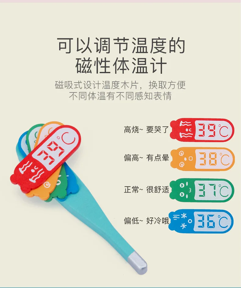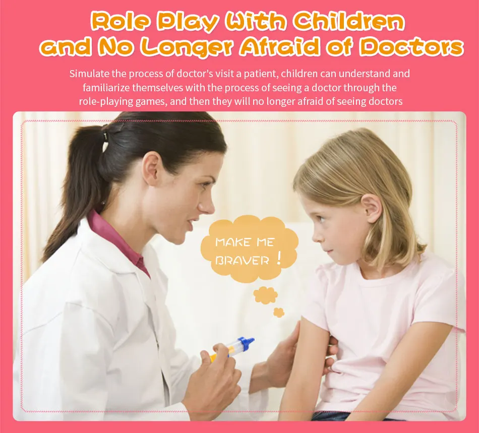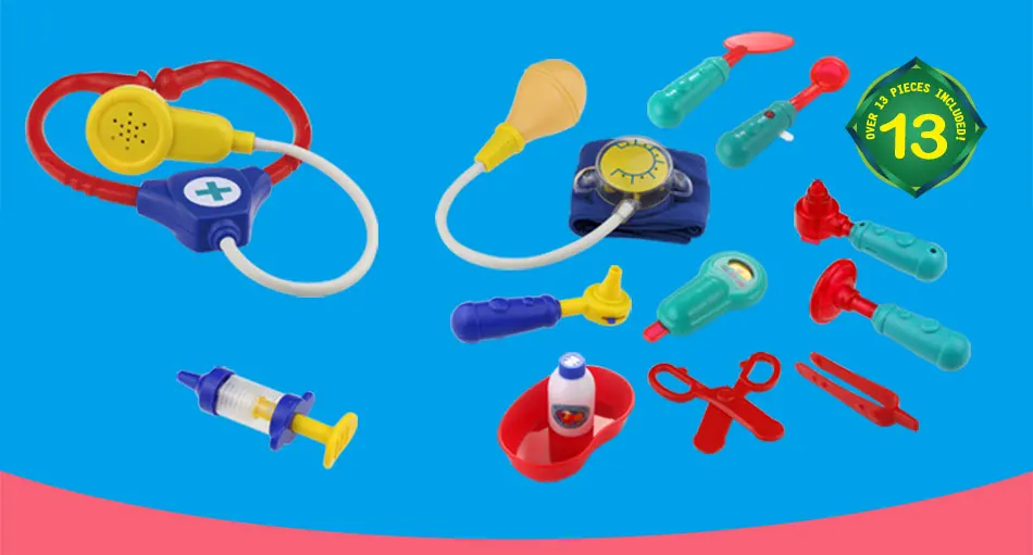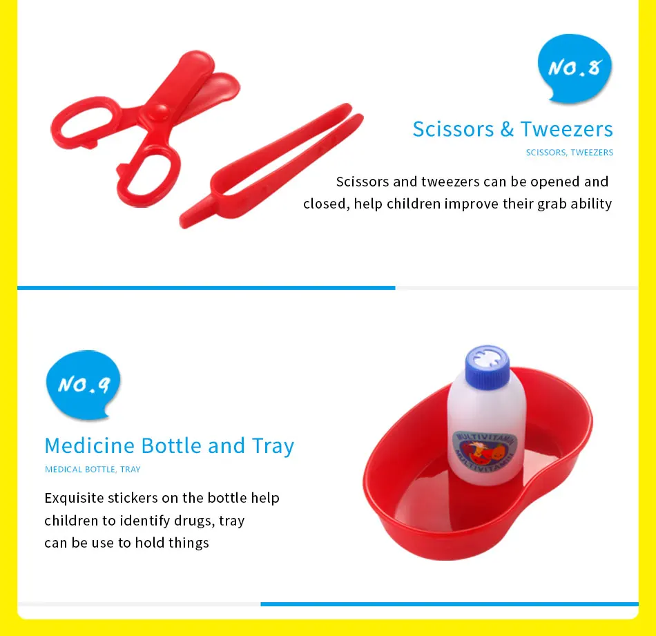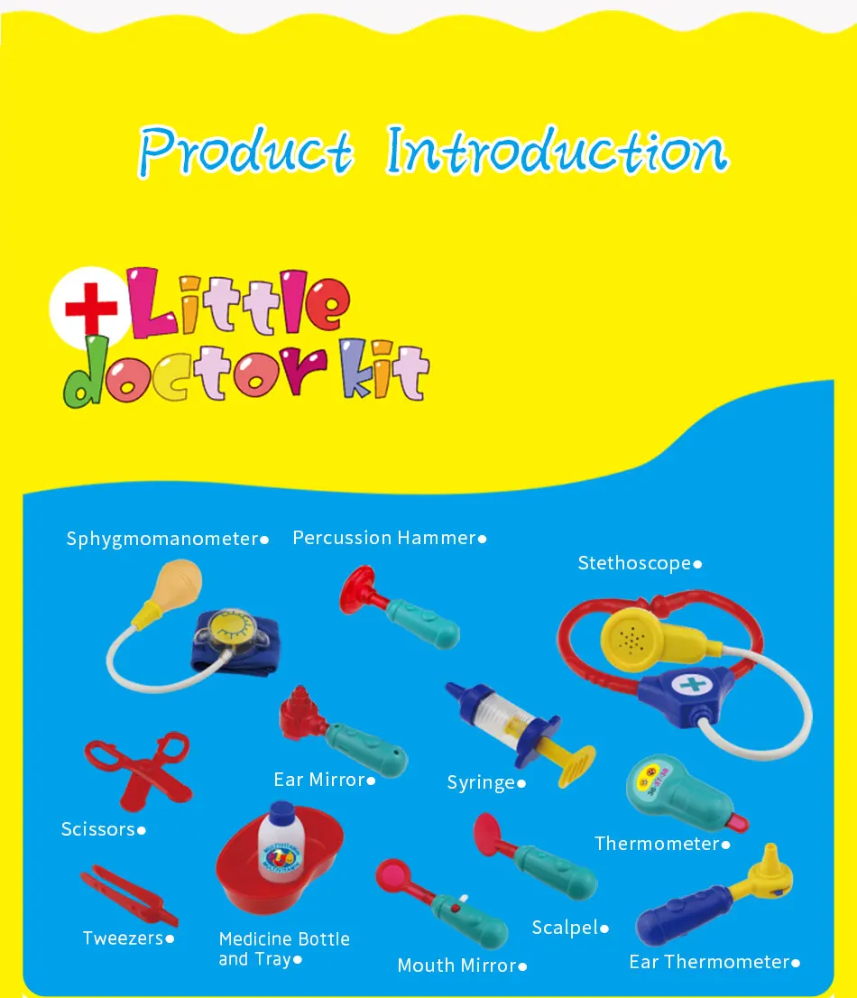 Стетоскоп имитирует доктора с помощью стетоскопа для осмотра детского тела, нажмите кнопку, чтобы сделать звук сердцебиения, силиконовый шланг может быть растянут, высокое качество и отсутствие запаха, зеркало для рта и ушное зеркало, используемое для проверки здоровья детей в области полости рта и уха Сфигмоманометр можно привязать к руке, Нажмите на желтый насос для измерения кровяного давления и желтое ветровое колесо на циферблате будет вращаться, силиконовый шланг также может растягиваться термометром, нажмите на термометр, чтобы сделать звук и показать улыбающееся лицо, Но он покажет плохое лицо, когда температура тела слишком высокая или слишком низкие пружины шприца расположены внутри, нажмите, чтобы сделать звук, имитация емкости идентификации, гладкая игла шприца может защитить детский ушной термометр, нацеленный на уши ребенка и вращать обе стороны ушного термометра, Это сделает звук и стимулирует развитие детского слуха, перкуссионный молоток и скальпель коснитесь сустава тела мягко может проверить реакцию нерва детей, arc дизайн для безопасных игровых ножниц и пинцетов ножницы и пинцеты можно открыть и закрыть, Помощь детям улучшить их способность захватывать лекарственные бутылки и лоток изысканные наклейки на бутылке помочь детям определить лекарство, лоток можно использовать для хранения вещей