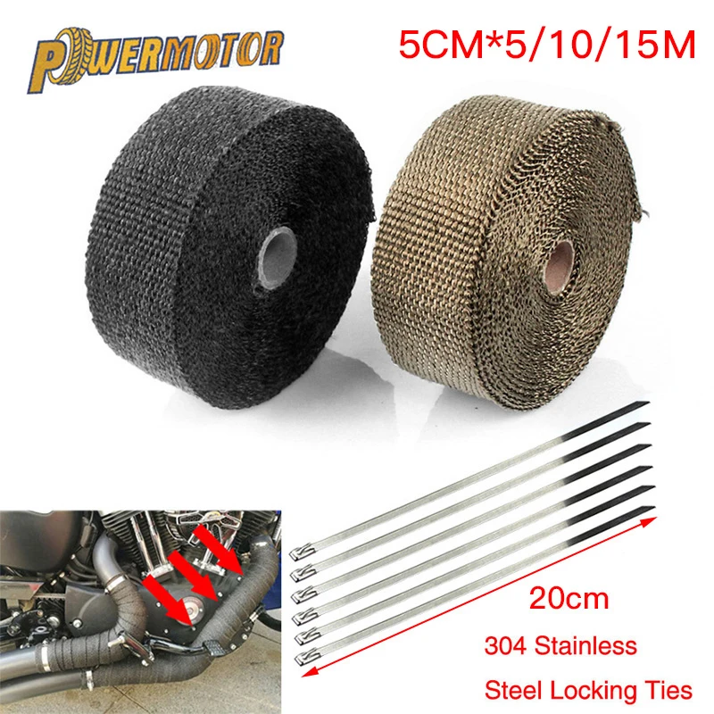 5 см * 5 м/10 м/15 м мотоцикл выхлопной тепловой щит Тепловая выхлопная лента стекловолокна Тепловая оберточная труба теплоизоляция с нержавеющими стяжками
