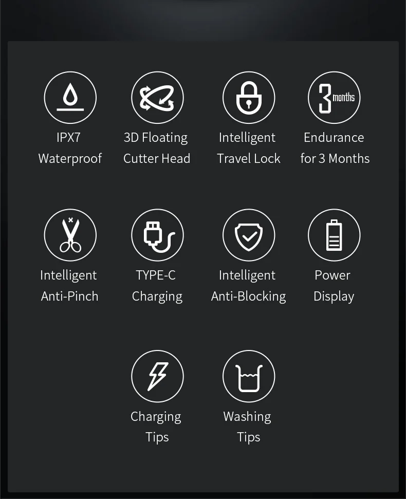 ● Водонепроницаемый IPX7 ● 3d-плавающая режущая головка ● Интеллектуальный дорожный замок ● Выносливость в течение 3 месяцев ● Интеллектуальный анти-пинч ● TYPE-C зарядки ● Интеллектуальная защита от блокировки ● Дисплей питания ● Подсказки для зарядки ● Советы по стирке