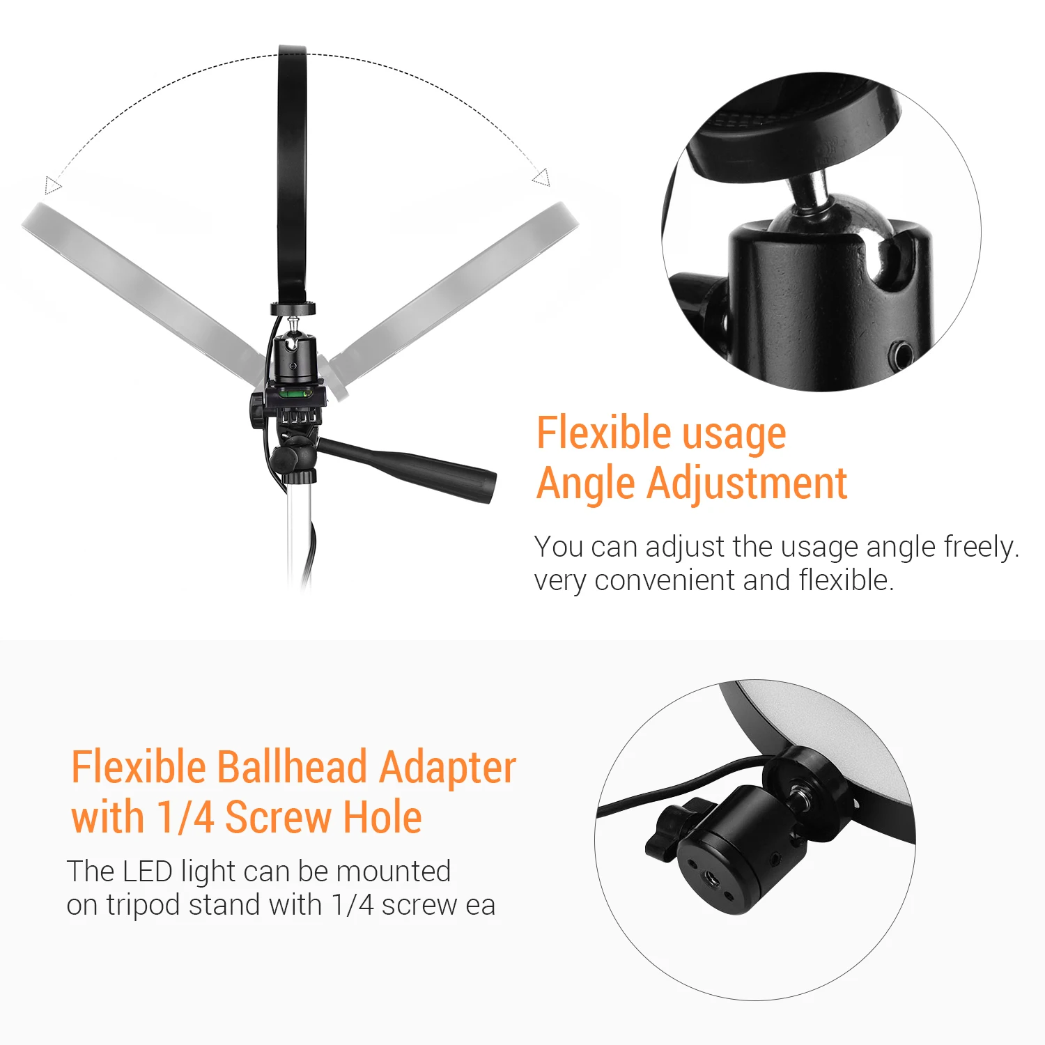 Оснащен поворотным шаровым адаптером, вы можете легко регулировать углы освещения, и установить кольцевой свет на Настольный/напольный штатив Стенд с 1/4 дюймовым винтом.