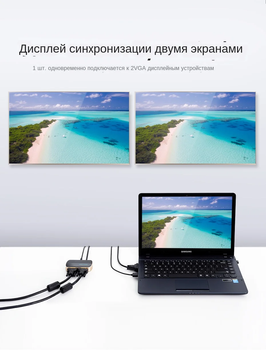 1. Разветвитель VGA ТОЛЬКО дублирует экран ноутбука / компьютера на дисплеи / мониторы / телевизоры высокой четкости. Таким образом, этот разветвитель VGA поддерживает только зеркальный режим и не может поддерживать режим расширения.