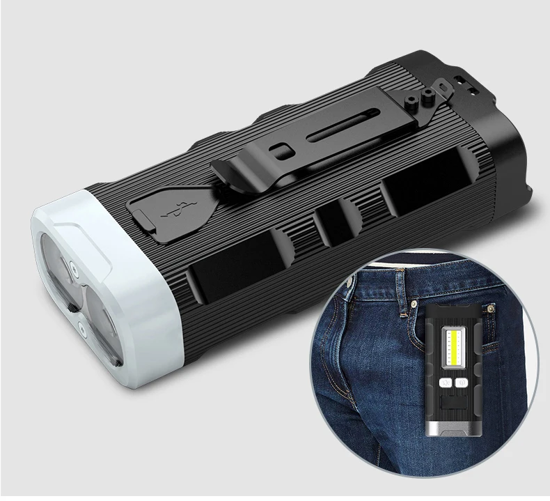 Основная особенность: двойной светильник s: велосипедные фары с композицией 2 * L2, основной светильник, COB для работы светильник. Хвост магнита помогает разместить лампу на Железном предмете с помощью складного кольца для переноски или подвешивания. Оснащен двумя перезаряжаемыми батареями и интерфейсом USB для зарядки, может использоваться в качестве группы питания смартфона.