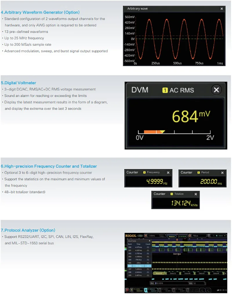1. largura de banda analógica: 350 МГц, 200 МГц, 100 МГц, e 70 МГц; largura de banda opçao de upgrade suportados 2. 2 ou 4 canais analógicos (экспансивель), padrao 16 canais digitais (LA sonda obrigatório) 3. até 8 GSa/s de taxa de amostragem em tempo real- 4. até 200 Mpts profundidade de memória (opçao) 5. alta taxa de captura de forma de onda (более 500000 wfm/s) 6. Auto de mediçao de parâmetros de forma de onda 41; full-funçao de mediçao de hardware de memória 7. UMA variedade de protocolo serial gatilhos e decodifica 8. até 450000 quadros de hardware в режиме реального времени 9. independente de pesquisa, as teclas de navegaçao, e tabela de eventos 10. Программное обеспечение embutido avançado 11. Integra Instrumento em 1 7 independente, incluindo um osciloscópio digital, um analisador de lógica, um analisador de espectro, um gerador de forma de onda arbitrarium, um um contador de freqüência e totalizador, e um analisador de protocolo 12. 9-polegada capacitiva мульти сенсорный экран, 256-ninvel de intensidade доска объявлений, com cor Persistência 13. Multiplas interfaces disponsiveis: USB HOST & DISPOSITIVOS, LAN (LXI), HDMI, TRIG OUT, e USB-GPIB 14. Веб-контроллер comando remoto 15. Уница версау де атуализасао онлайн 16. Новый дизайн e delicado industrial, fаcil de operar