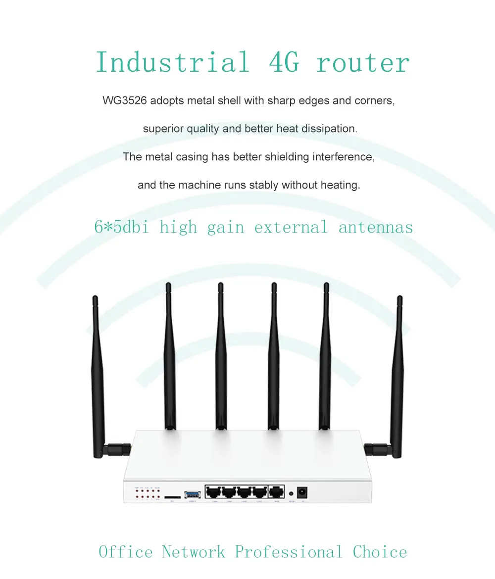 Оборудование: WG3526-4G использует решение MTK7621, до 880 МГц. Он поддерживает 5*10/100/1000 м RJ45 порт, 1 * USB 3,0, 1 * внутренний интерфейс PCI-E, 1 * Micro SD карта и так далее. Беспроводная: Он совместим с протоколом беспроводной сети IEEE802.11AC/N/G/B/A. Максимальная скорость беспроводной передачи данных до 1200 Мбит/с. Внешние 4 шт 5dBi антенны могут сделать хорошую беспроводную производительность и более широкое покрытие Программное обеспечение: Оригинальный OpenWrt на базе Linux включает сертификацию 802.11ac, IPV6 и Win8, которая предоставляет драйверы для поддержки программного обеспечения верхнего слоя, аудио и сенсорного экрана. L7 QoS может работать с ускорителями on-комплектующие микросхемы HNAT/HQoS гладко, он также обеспечивает функцию Auto QoS для интернет-и SMB-маршрутизаторов. Спецификация: Новый двухъядерный сетевой чипсет MT7621, до 880 МГц Обеспечивает 5*10/100/1000 Мбит/с RJ45 порты Обеспечивает 1 * Внешний USB 3,0 Обеспечивает 1 * PCI-E интерфейс для поддержки 3G/4G Обеспечивает 1 * Micro SD карту Совместимость с IEEE IEEE802.11AC/N/G/B/A беспроводным стандартом Скорость беспроводной передачи данных до 1200 Мбит/с