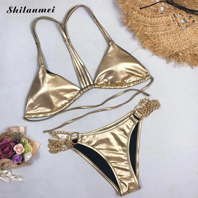 Женский купальник, бикини, наборы, высокая талия, пляжный купальник, Femme, металлик, бикини, стринги, золото, лето, женский бикини, 2020, пляжные комплекты