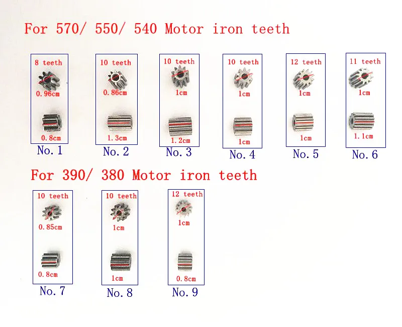 Скорость электродвигателя постоянного тока, чем меньше крутящий момент, тем медленнее скорость, тем больше крутящий момент Напряжение: 6 В/12 В 570 Мощность двигателя: 65 Вт 550 Мощность двигателя: 25-45 Вт 390 Мощность двигателя: 20-35 Вт 380 Мощность двигателя: 15-25 Вт Скорость: 30000 об/мин> 15000 об/мин> 8000 об/мин Крутящий момент: 8000 об/мин> 15000 об/мин> 30000 об/мин Крутящий момент и мощность: 570> 550> 390> 380 Если вашему двигателю необходимо установить другие шестерни, пожалуйста, свяжитесь с нами