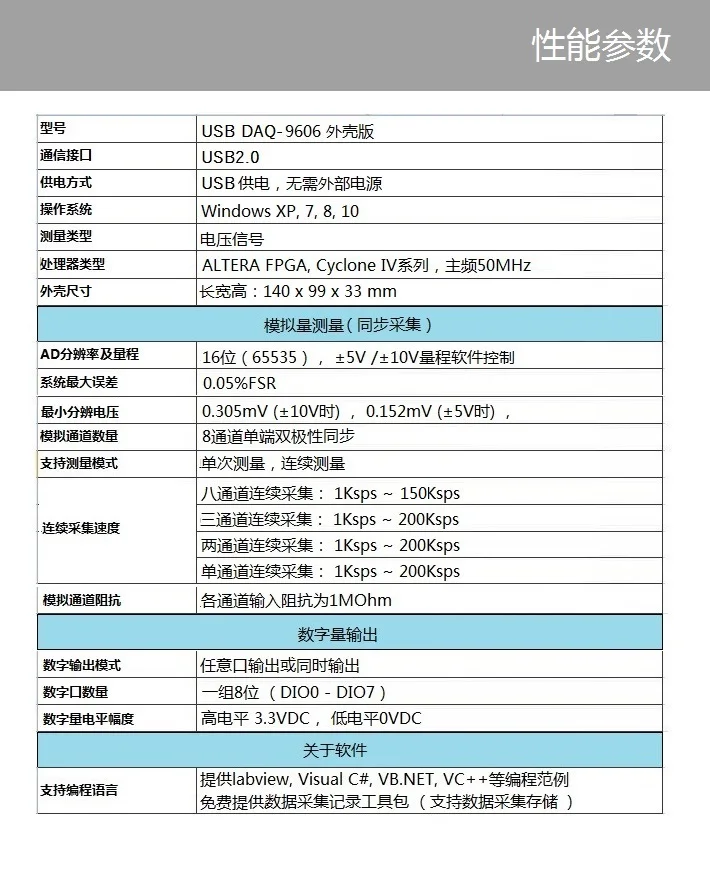 USBSeries16BitADCard выбор продукта Модель Режим связи Разрешение экрана Диапазон ADChannel Общая скорость синхронизации Одноканальная скорость Цифровой порт DAQ-7606i USB2.0 16 бит ± 5,± 10 8 20K * 8 100K X DAQ-7606i корпус USB2.0 16 бит ± 5,± 10 8 20K * 8 100K X DAQ-7616i USB2.0 16 бит ± 5,± 10 16 20K * 16 100K X DAQ-8606i многофункциональное издание USB2.0 16 бит ± 5,± 10 8 25K * 8 200K 8 проезжей части DAQ-9606 USB2.0 16 бит ± 5,± 10 8 150K * 8 200K 8 выходов