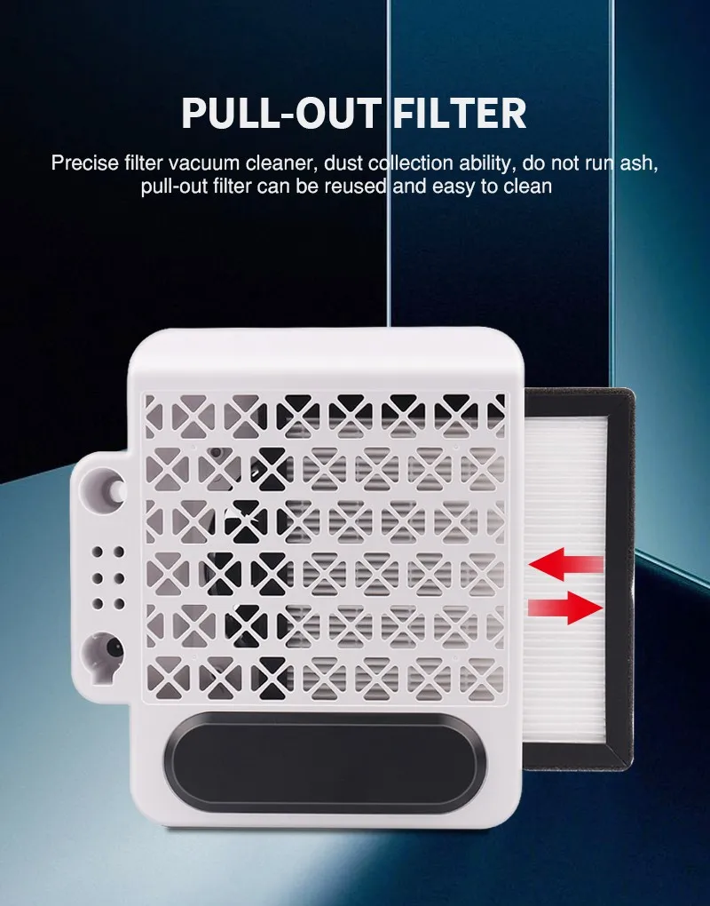 ⒉ Пылесос для ногтей: 45000 об/мин, сильная сила ветра, мощный тонкий фильтр тягового типа в японском стиле, без пыли/без рассыпчатой золы, высокая способность к вакуумированию, тонкий фильтр натяжного типа можно использовать повторно и легко чистить.