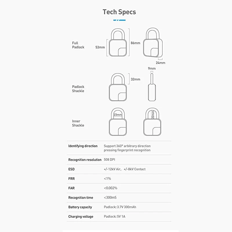 Долгий срок службы батареи и usb-зарядка: Встроенный литиевый аккумулятор 300 мА · ч, один раз зарядка может разблокировать 2500 раз, в режиме ожидания 1 год