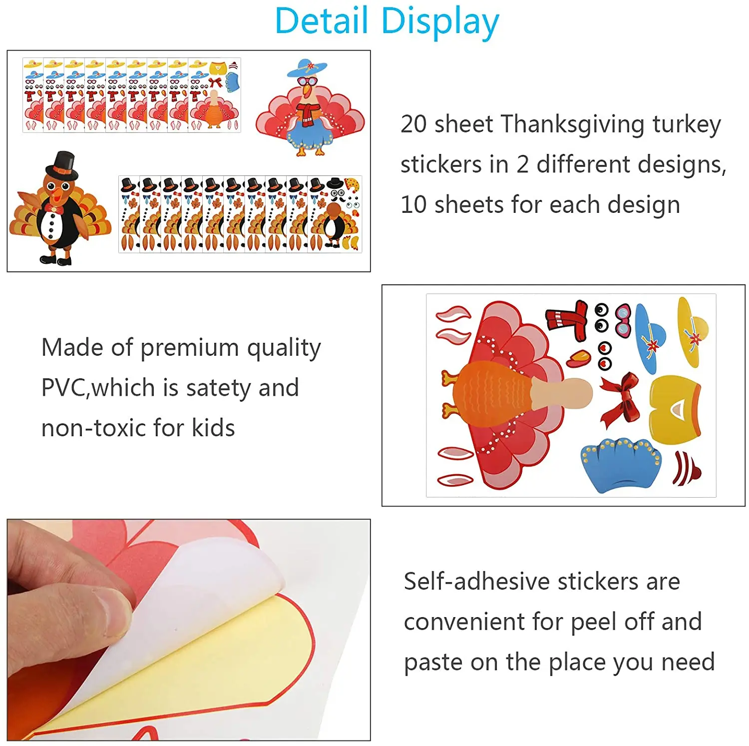DIY Turkey Stickers:Package contains with 20 sheet Thanksgiving turkey stickers in 2 different designs,10 sheets for each design,the large quantity fits to share with friends or create different Turkey shape.