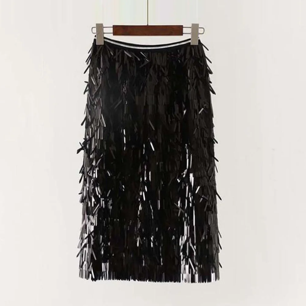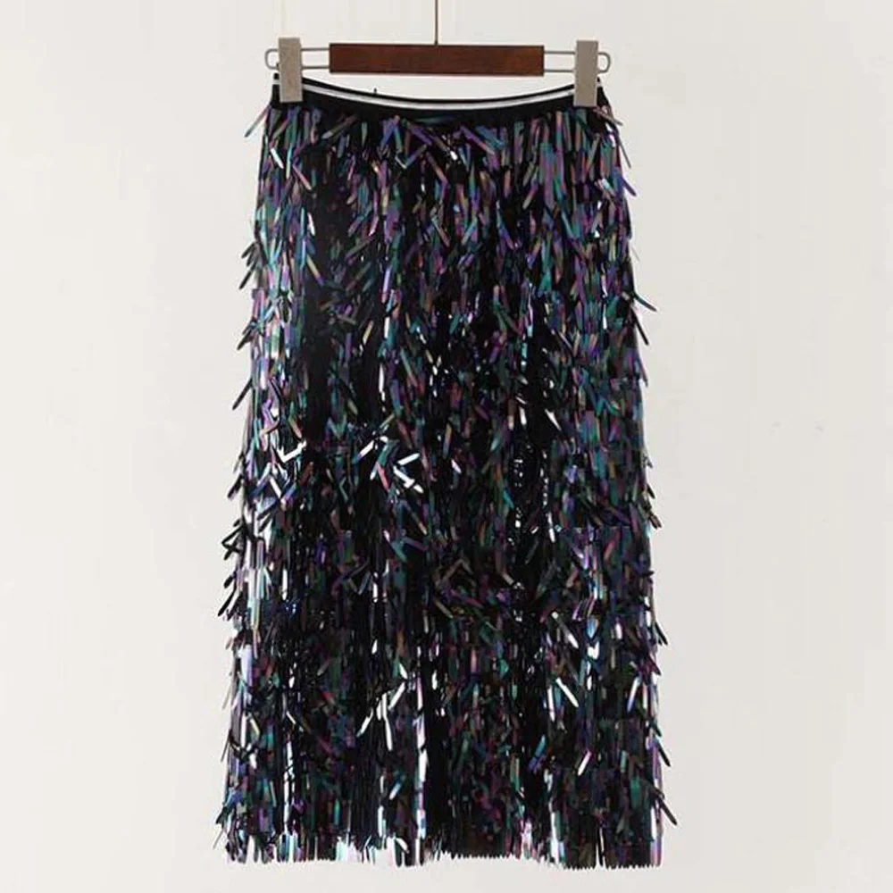 * Описание юбки: летние женские блестящие вечерние юбки с бахромой и блестками; Цвет черный, серебристый; Пикантная Юбка Faldas Mujer; Миди-юбка с высокой талией