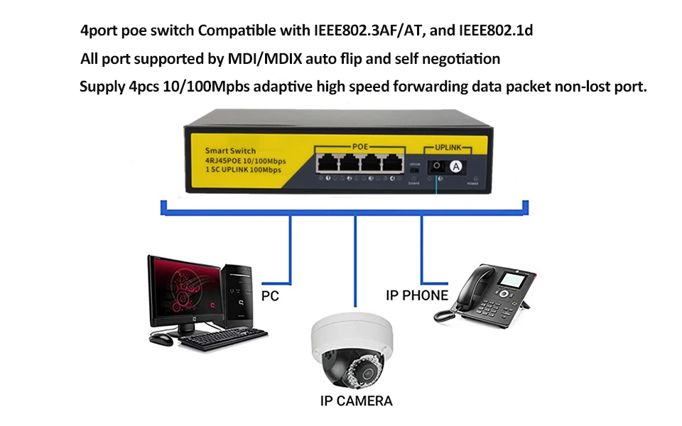 ◆ 4*10/100 Мбит/с POE порта, 1*10/100 Мбит/с-Link SC порт 【Poe порт: 100 м дальность передачи, 250 м после использования расширенная функция; Оптоволоконный порт: до 20 км ◆ Совместим с IEEE802.3AF/AT и IEEE802.1d ♦ Вся мощность: 65 Вт (52 в 1.25A) ④ Все порты, поддерживаемые MDI/MDIX auto flip и само определение ◆ Поставка 4 шт 10/100Mpbs адаптивный высокоскоростной пакет данных пересылки, не утерянный порт. 【Добавьте устройство высокого уровня защиты от молнии, до 6000 В. ④ Каждый порт Макс. Источник питания достигает 30 Вт. ♦ Низкий нагрев, безопасный и надежный, высокая стабильность