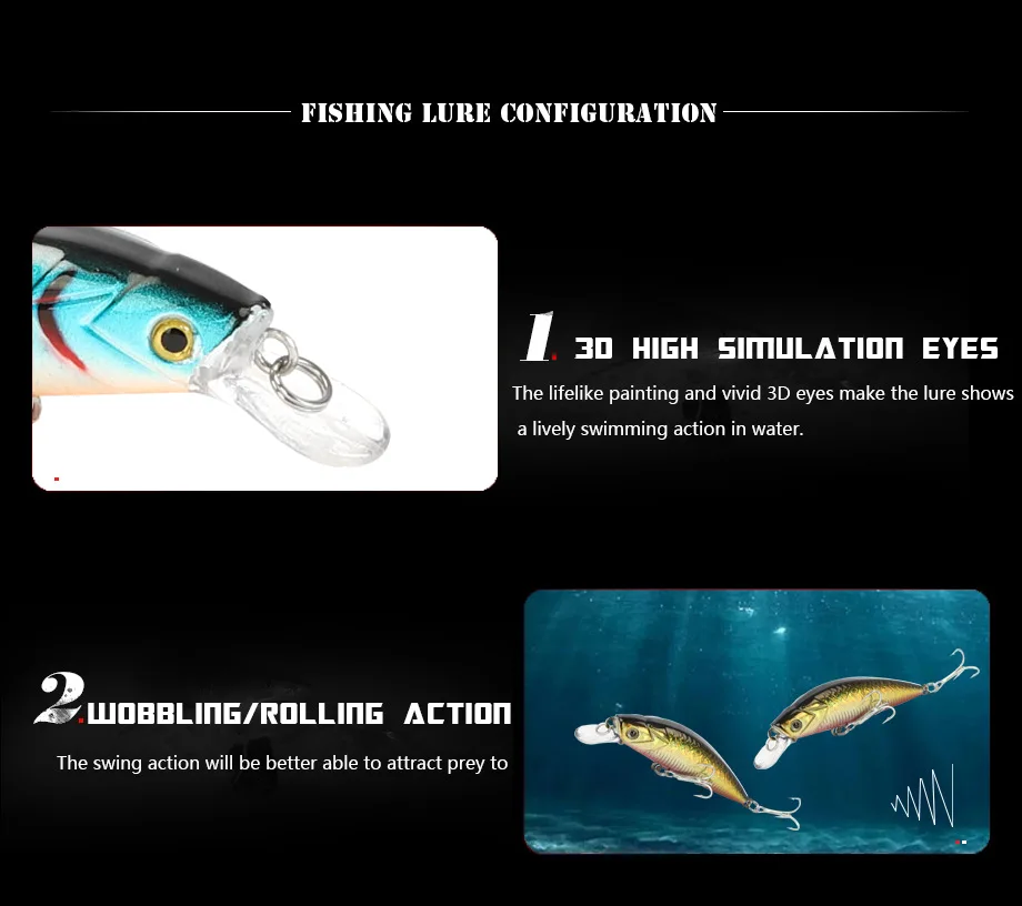 3D-глаза делают его идеальным инструментом для любителей рыбалки.Красочный корпус позволяет легко ловить рыбу.Реалистичные и быстрые действия в воде.