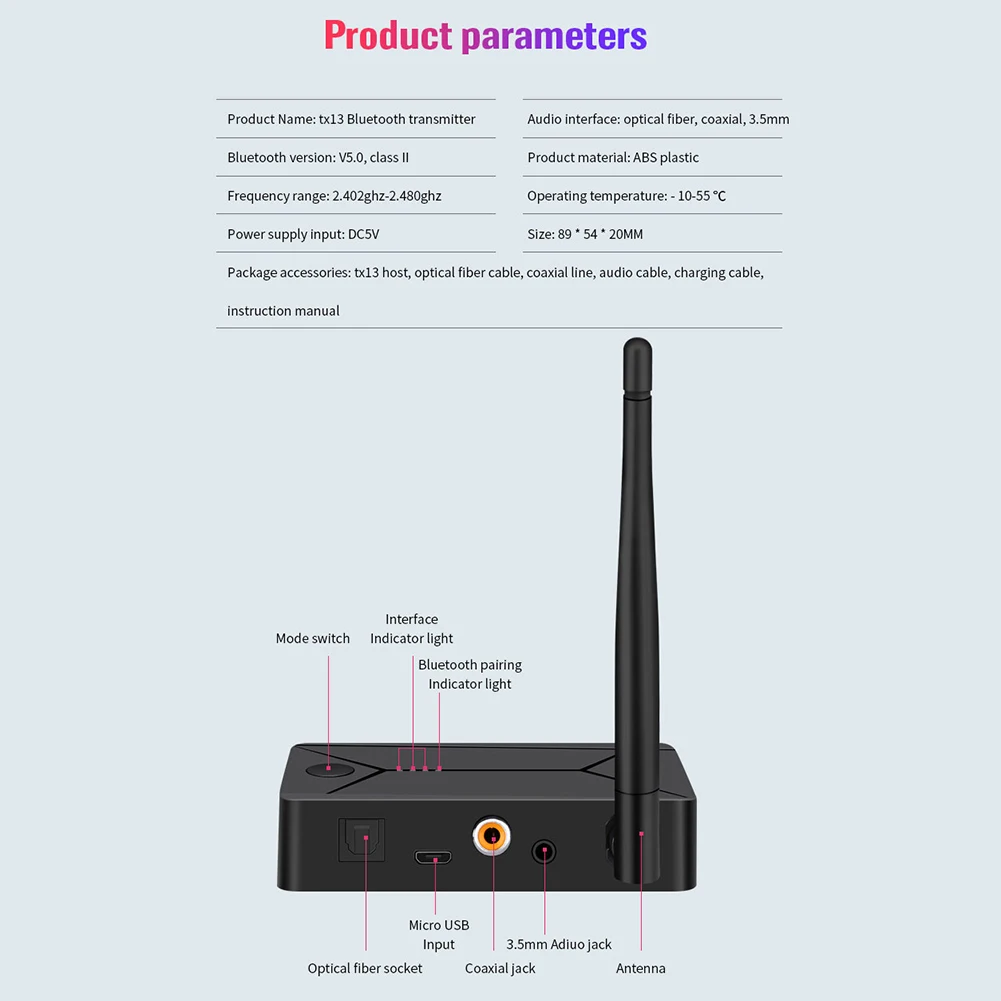 * 1. TX13-это bluetooth-адаптер с оптическими/коаксиальными/AUX интерфейсами, с Bluetooth передачей и цифровым аналоговым адаптером. Он может передавать музыку с вашего мобильный телефон, Walkman, телевизор, компьютер и другие устройства по беспроводной сети на ваш bluetooth-приемник, стерео Bluetooth наушники, Bluetooth колонки и другие устройства.