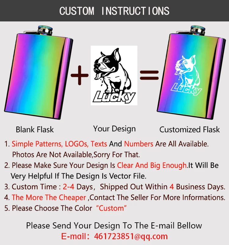 1. Доступны текст (на вашем языке), номер, логотип и простой рисунок. 2. Изображения и фотографии недоступны, спасибо за понимание. 3. Если вы хотите заказать фляжку, не забудьте отправить дизайн продавцу. Было бы очень полезно, если дизайн в векторе. Пожалуйста, не стесняйтесь связаться с продавцом для получения дополнительной информации.