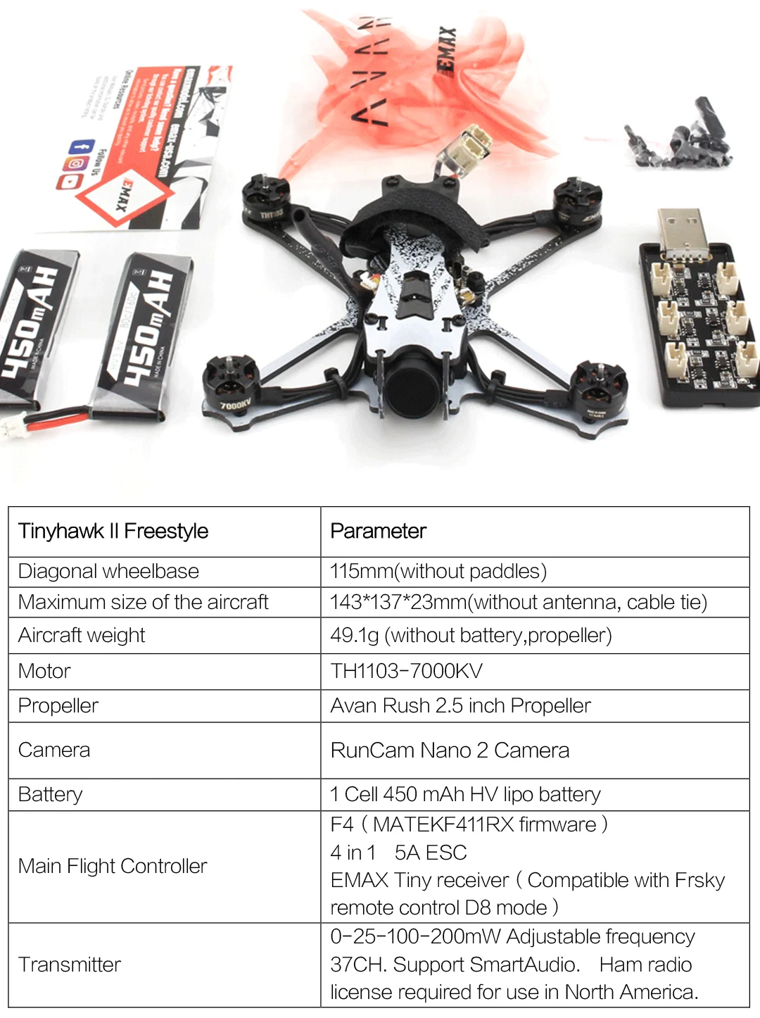RTF список продуктов: 1. Tinyhawk II Фристайл × 1 2. Радио × 1 3. Очки × 1 4. Goggle батарейный блок (включая 1 батарею 18650) × 1 5. Emax 1s HV 450 mAh × 2 6. Зарядное устройство × 1 7. Usb-кабель для передачи данных × 1 8. Руководство пользователя веб-сайт карта × 1 9. Набор пропеллеров (2x CW, 2x CCW) 10. Винтовая упаковка x 1 С управлением от первого лица без контроллера упаковочный лист 1. Tinyhawk II Фристайл × 1 2. Руководство пользователя веб-сайт карта × 1 3. Emax 1s HV 450 mAh × 2 4. Зарядное устройство × 1 5. Набор пропеллеров (4x CW, 4x CCW) 6. Винтовая упаковка x 1