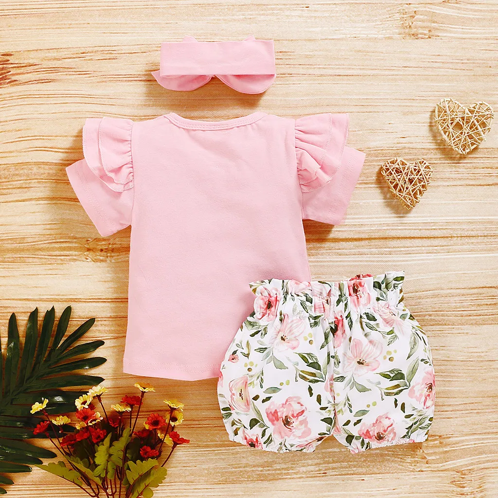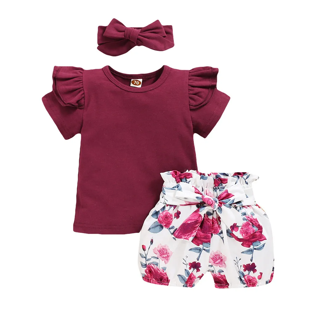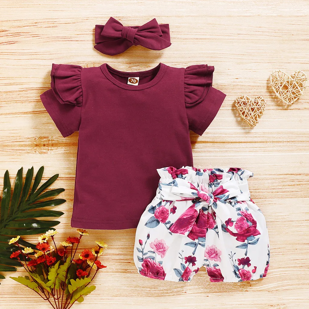 Однотонный топ с оборками для новорожденных девочек + шорты с цветочным принтом + повязка на голову