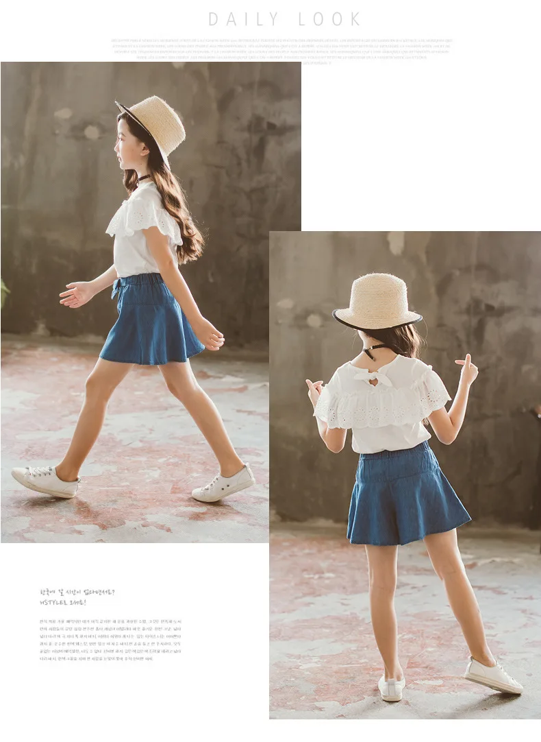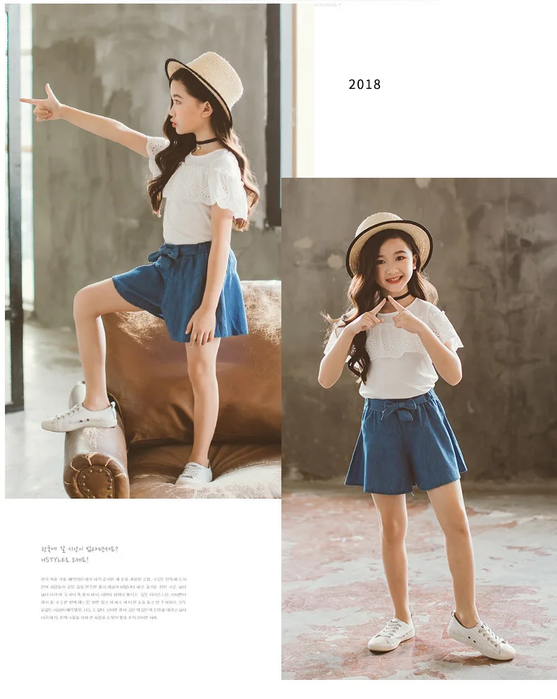 Комплект одежды для девочек, белая футболка, джинсовые шорты, 2 предмета, детская одежда для девочек, От 3 до 12 лет, детские костюмы для подростков