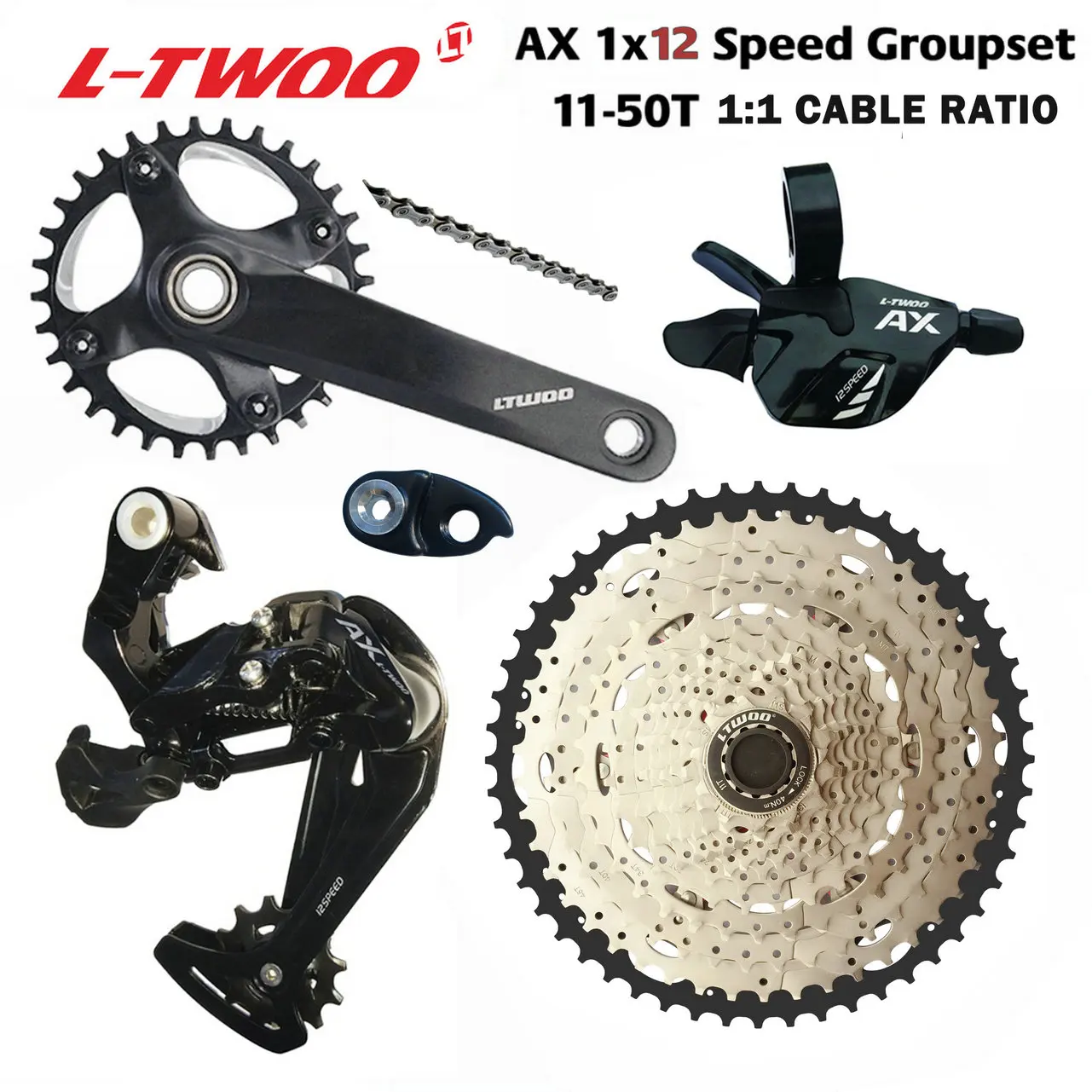 1:1 технология делает точный и быстрый ответ Алюминий рычаг переключения передач Кабель переключения передач с технологией hyper low-friction coating tech 120 г AX 1x12 задний переключатель 12 Скоростей Мега звездочки: 11-50T 11-52T Shadow RD с наклонным дизайном Длинная клетка Большой подшипник шкива 243 гКоленчатый набор 170-34/36T 175-34/36T