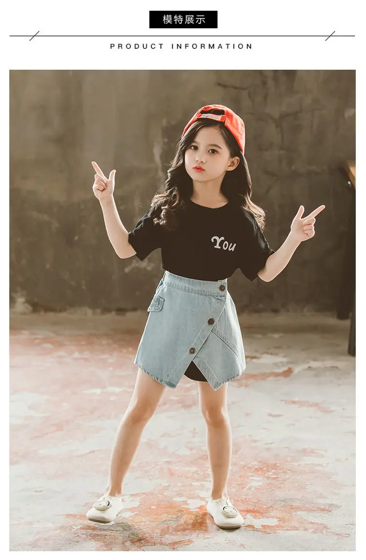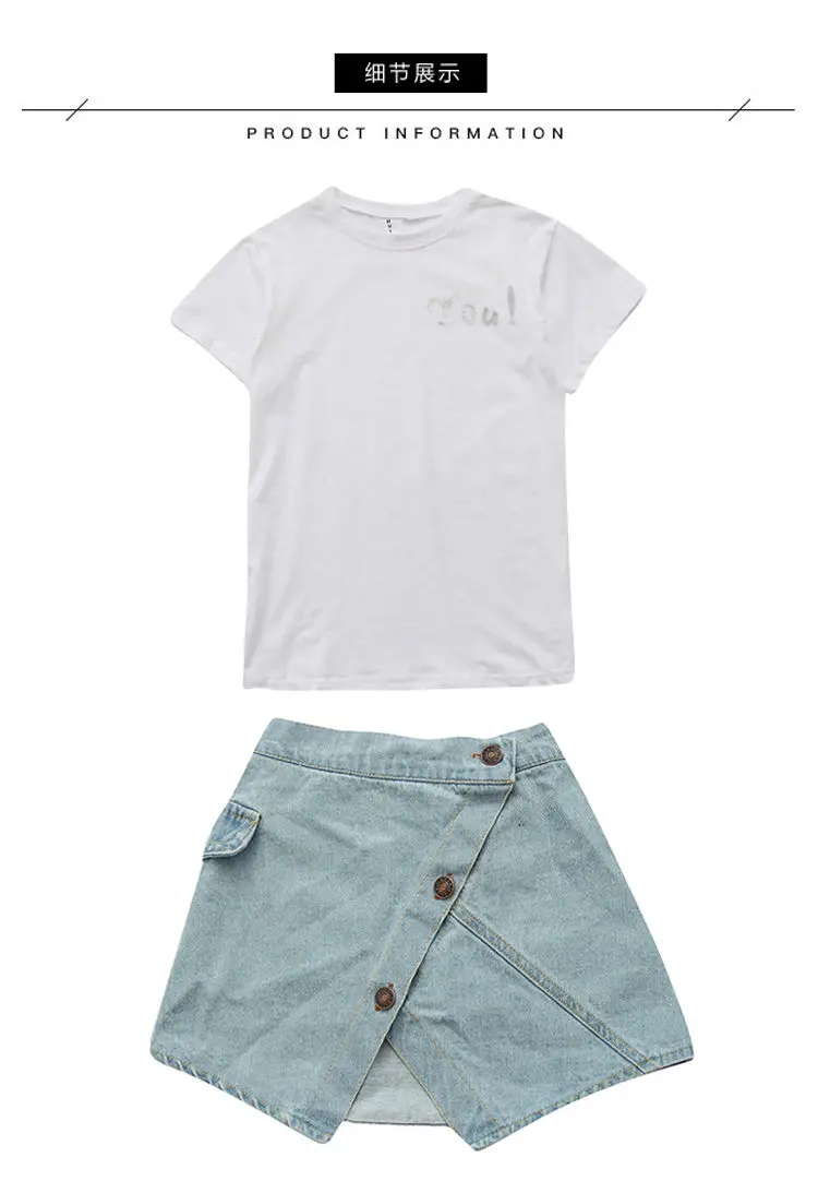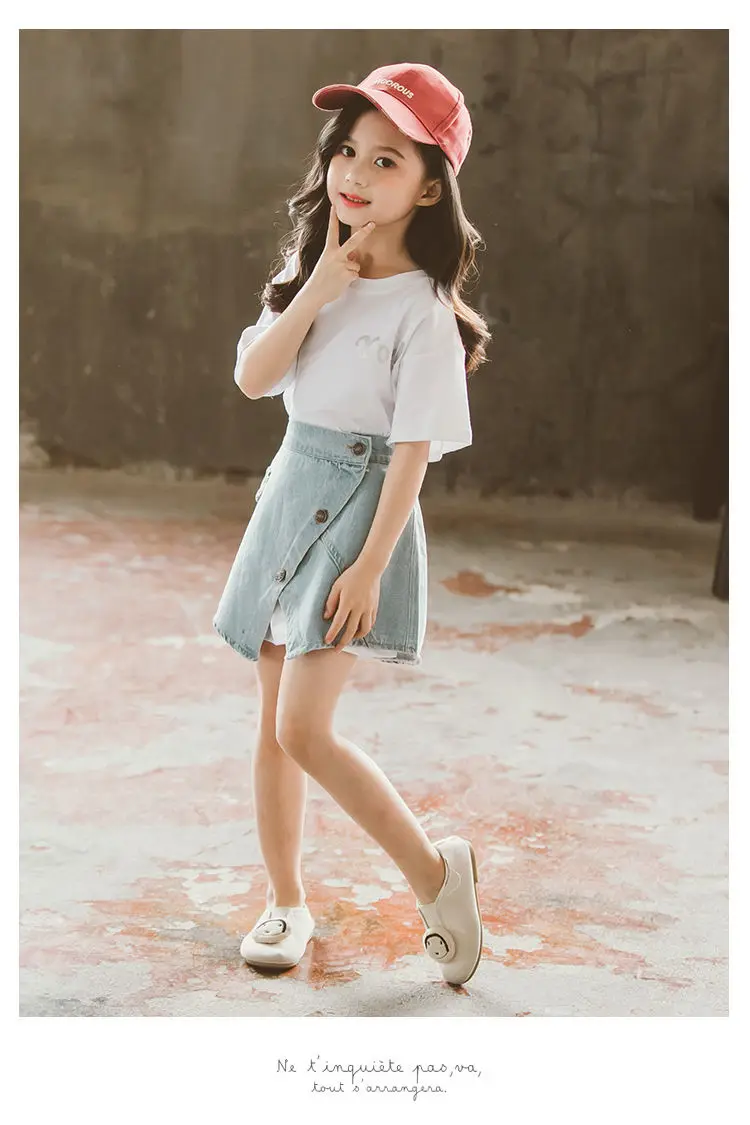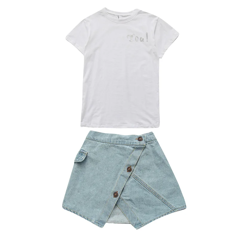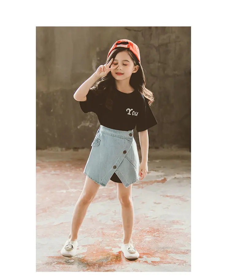 Летний комплект одежды для девочек, футболка, джинсовая юбка, 2 предмета, детская одежда для девочек, От 3 до 12 лет, одежда для подростков