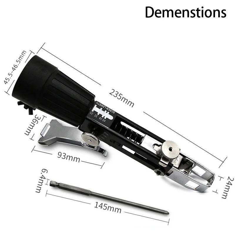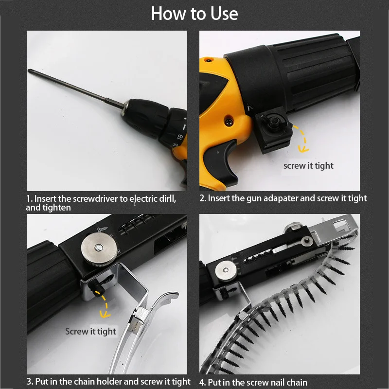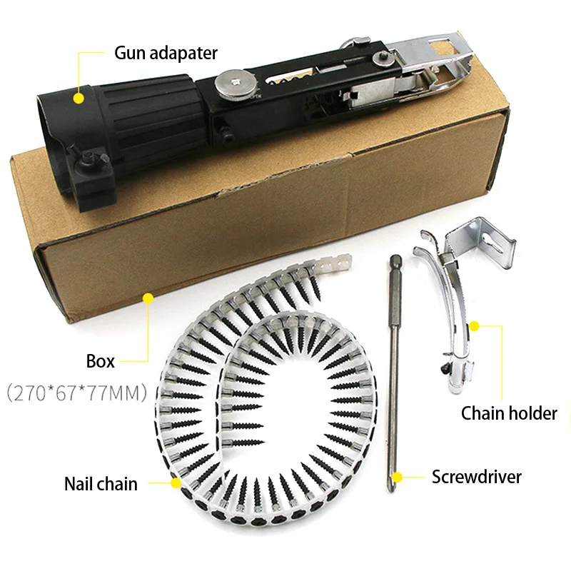 Автоматическая Цепь Гвоздь пистолет адаптер винтовой пистолет для электрической дрели деревообрабатывающий инструментСделайте ваше электрическое сверло в автоматическую цепь гвоздя пистолетаВы можете повторно установить гвозди в цепь удобноРегулируемая длина глубины.Спецификация: