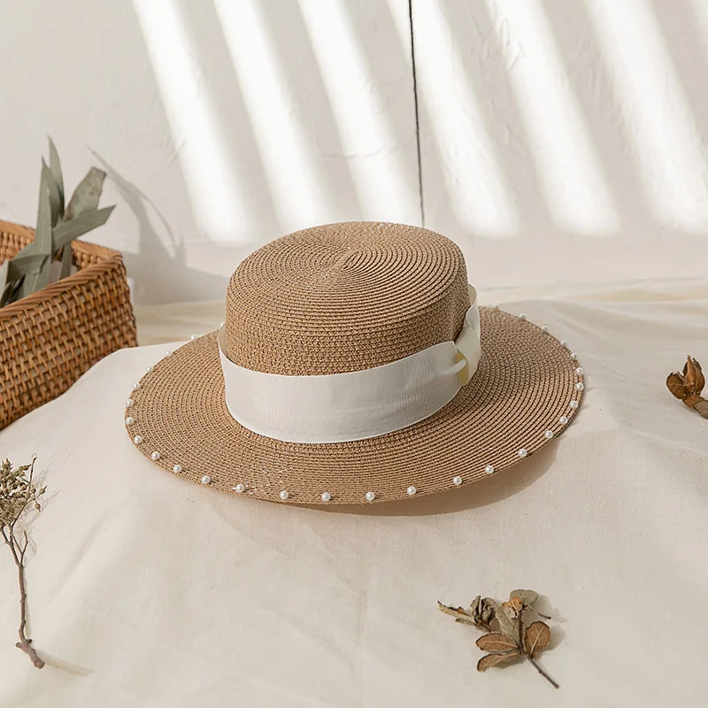 Женская Соломенная шляпка ручной работы, Пляжная шляпка с плоским верхом, украшенная жемчугом, для путешествий, для защиты от солнца, банкета и торжественных случаев, весна-лето