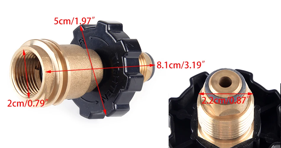 Адаптер для пропанового бака преобразует сервисный клапан, подходящий для POL в QCC1 тип 1 ключ для сочленения гибких шлангов для ручного затягивания