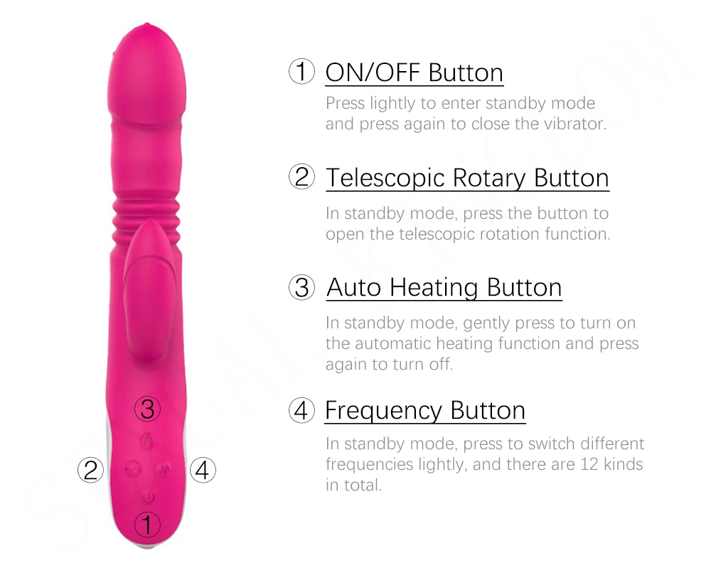 ①Кнопка ВКЛ/ВЫКЛ: слегка нажмите, чтобы войти в режим ожидания И нажмите еще раз, чтобы закрыть вибратор. ②Телескопическая Поворотная кнопка: в режиме ожидания нажмите кнопку, чтобы Откройте функцию телескопическая ротация. ③Кнопка автоматического нагрева: в режиме ожидания Аккуратно нажмите, чтобы включить Функция автоматического нагрева и нажатия Еще раз, чтобы выключить. ④Кнопка частоты: в режиме ожидания, нажмите, чтобы переключиться по-разному Частоты слегка, и есть 12 видов В общей сложности.