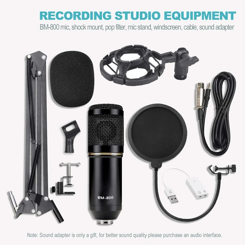 Профессиональное Оборудование студии звукозаписи: оснащен BM-800 микрофоном, амортизирующим креплением, P op фильтром, регулируемой подвеской, ножничной подставкой, защитой от ветра, кабелем питания, звуковой картой