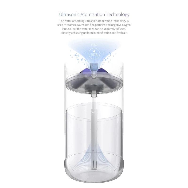 Ультразвуковая технология распыления, водопоглощающая ультразвуковая технология распыления используется для распыления воды в мелкие частицы и отрицательные ионы кислорода, так что водяной туман может быть равномерно рассеян, тем самым достигается равномерное увлажнение и свежий воздух.