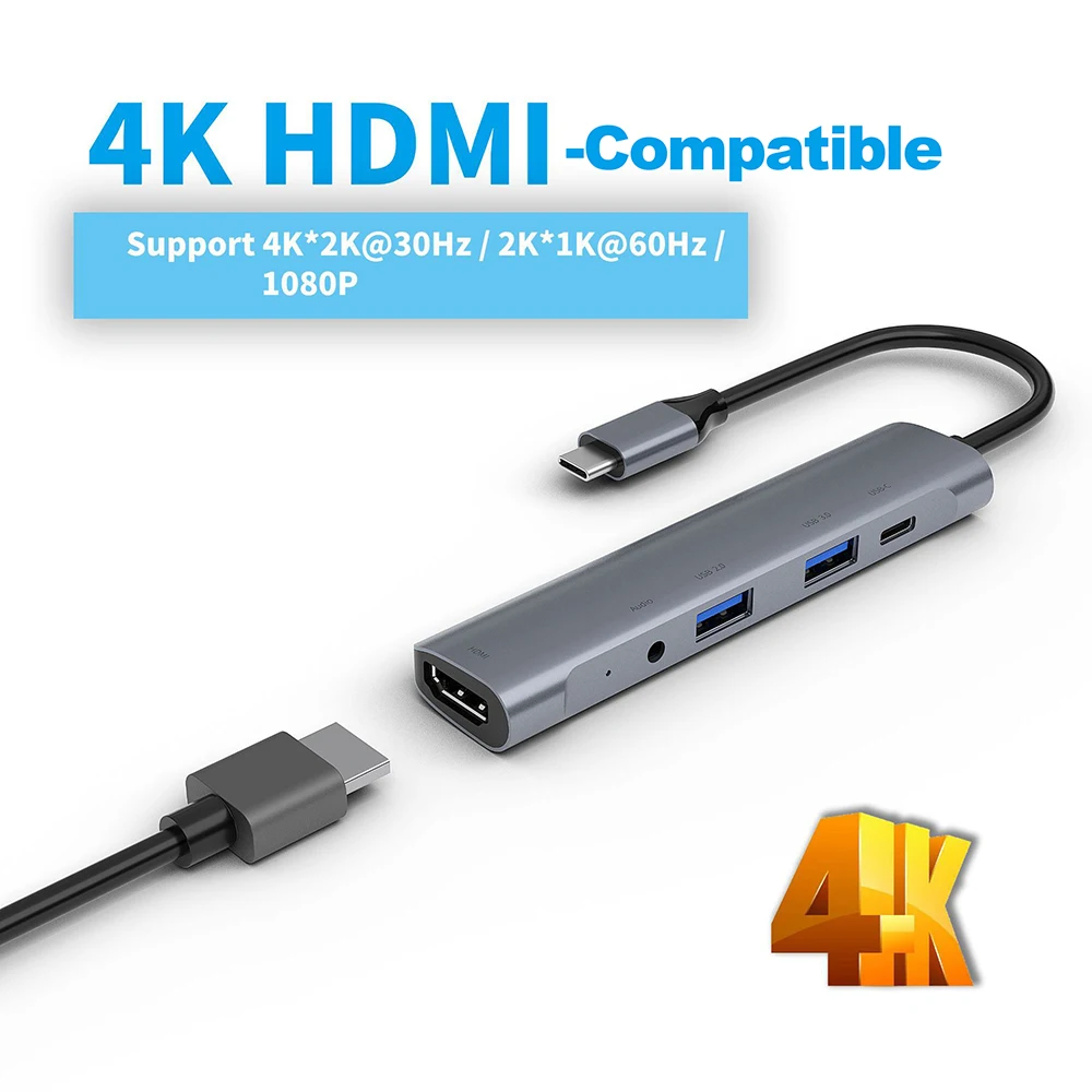 ОВБР 5 в 1 USB-C концентратор Тип C до 4K HDMI совместимых с 3,5 мм аудио разъем адаптер кабель-Переходник USB C на USB 3,0/2,0 60 Вт Тип-c PD док-станция для Macbook