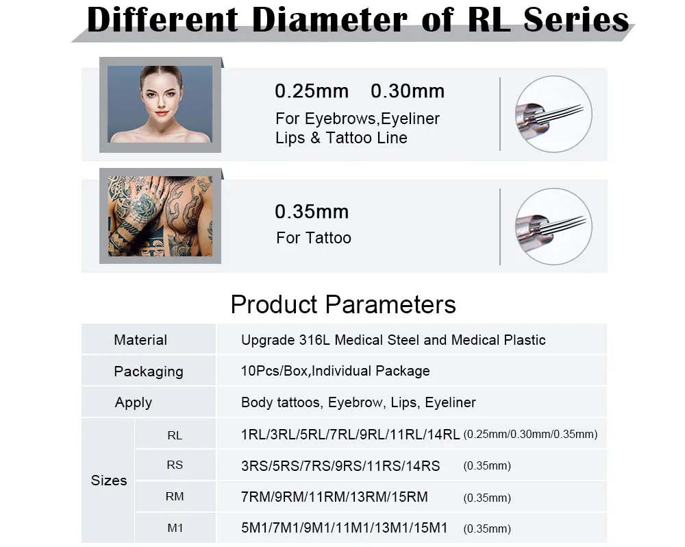 5.RL/RM/M1/RS четыре дополнительных типа с несколькими размерами будут соответствовать различным иглы татуировки.