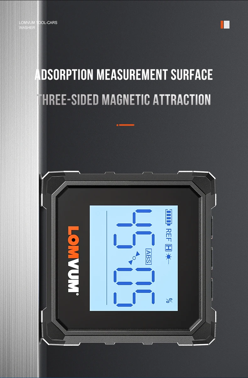 Измерение угла: с включением питания, поместите продукт оN уклон, и значение, отображаемое на экране, является углом между текущей поверхностью и горизонтальной плоскостью