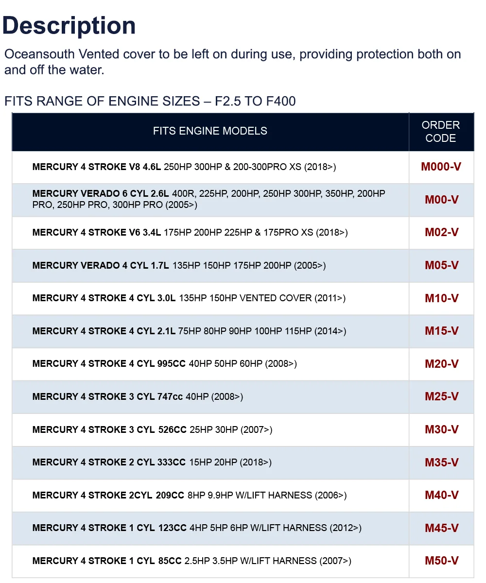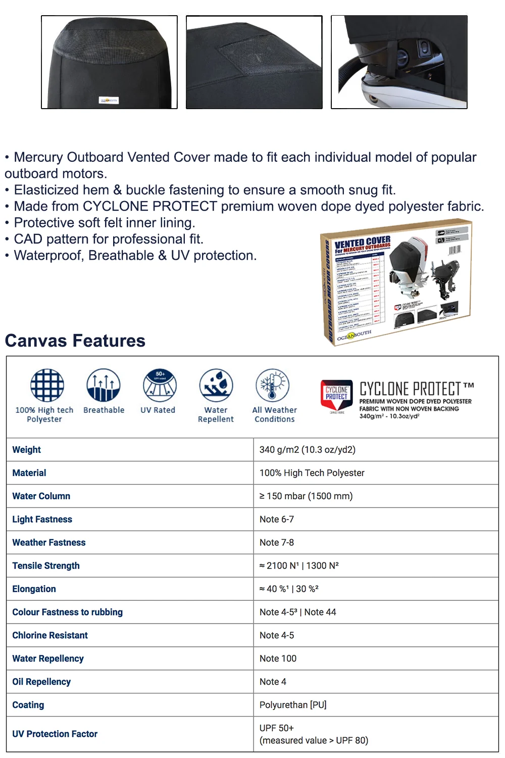 • Ртутный подвесной вентилируемый чехол, изготовленный для каждой индивидуальной модели популярных подвесных моторов.
