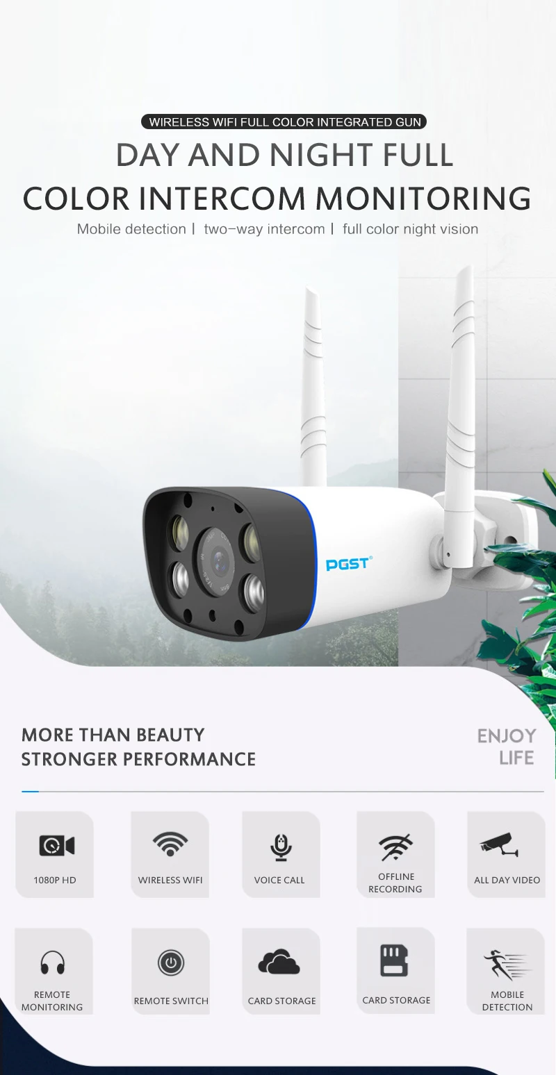 Характеристики: звукозапись, инфракрасное/ночное видение, обнаружение движения, защита от атмосферных воздействий, широкий угол, водонепроницаемость, хранение облаков, двустороннее аудио, цветное ночное видение,
