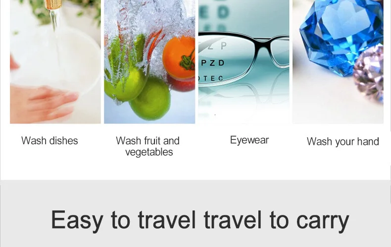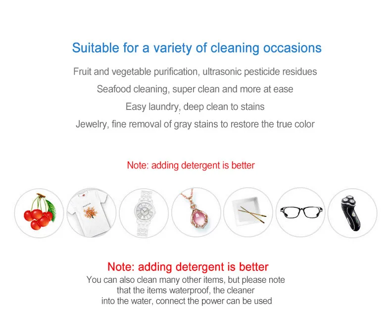 Подходит для различных случаев уборки Очистка фруктов и овощей, ультразвуковые Остатки пестицидов Чистка морепродуктов, супер чистый и более легкий Легкая стирка, Глубокая очистка от пятен Ювелирные изделия, хорошее удаление серых пятен, чтобы восстановить истинный цвет Примечание: лучше добавить моющее средство Советы