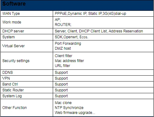 Этот Wi-Fi роутер WE2416 использует беспроводное решение нового поколения для обеспечения стабильной производительности. 2,4 ГГц Беспроводная скорость передачи данных до 300 Мбит/с, он обеспечивает 1 взаимный обмен данными между компьютером и периферийными устройствами 2,0 порт, 1 сим-картой разъем карты для поддержки 3G/4G Функция после установки 3G/4G модуль PCIE внутренней части маршрутизатора. Он предоставляет светодиодный индикатор силы сигнала 3G/4G, чтобы показать состояние сигнала. Характеристики: принять беспроводное решение QCA9531, скорость передачи 300 Мбит/с, основная частота до 580 МГц, чтобы обеспечить стабильную работу системы. Соответствует Протоколу IEEE802.11b/802,11g/ 802.11n/802,3/802.3u. Оснащен 5 адаптивными интерфейсами Ethernet 10/100 Мбит/с, поддерживает Auto MDI/MDIX. Обеспечивает один интерфейс USB2.0, может подключаться к usb-устройствам хранения данных или устанавливать usb-сетевую карту доступа к Интернету. Аппаратная Функция watchdog обеспечивает стабильную работу модуля 4G и системы маршрутизации в течение длительного времени. Поддержка шифрования WPA2, обеспечивает безопасную передачу данных. Спецификация: Оборудование Основной набор микросхем: QCA9531 Оперативная память: DDR2 128 Мб Вспышка: SPI 16 Мб Протокол: IEEE802.11b/802,11g/802.11n/802,3/802.3u Скорость беспроводной связи: 2,4G, 300 Мбит/с Рабочая частота: 2,4 ГГц Применимый диапазон частот: LTE FDD: B2/B4/B5/B12/B13/B14/B66/B71 WCDMA: B2/B4/B5 Адаптер питания: 12 В/1 а постоянного тока Максимальная потребляемая мощность: менее 12 Вт Программное обеспечение Тип WAN: PPPoE, динамический IP, статический IP,3G(4G) циферблат Режим работы: маршрутизатор DHCP сервер: сервер, список клиентов, назначение статического адреса Виртуальный сервер: переадресация портов, DMZ хост Поддержка ОС: SDK, openwrt Настройка безопасности: клиентский фильтр, фильтр mac-адреса, фильтр URL DDNS: Поддержка Vpn-интерфейс: Поддержка Переключение веб-темы: не поддерживается Управление пропускной способностью: Поддержка Статическая маршрутизация: Поддержка Другие Рабочая температура: 0 Цельсия ~ 40 Цельсия; Температура хранения:-40 по Цельсию ~ 70 по Цельсию; Рабочая влажность: 10% ~ 90% без конденсации Влажность хранения: 10% ~ 90% без конденсации Тип штепсельной вилки: штепсельная вилка США, применяется в Канаде, Индии, Японии, Мексике, Таиланде, Тайване, США, Филиппинах и т. д./Штепсельная вилка европейского стандарта, применяется в Индонезии, Германии, Франции, Испании, Италии и так далее. Цвет: черный Материал: пластик Размер: 17*11*2,7 см Посылка: 1 * маршрутизатор 1 * сетевой кабель 1 * Адаптер питания 2 * антенны 2 * скобы 1 * пакет винтов 1 * Руководство пользователя Только вышеуказанная посылка, другие товары не включены. Примечание: светильник и различные дисплеи могут привести к тому, что цвет товара на картинке немного отличается от реального. Допускается погрешность в измерениях +/- 1-3 см.