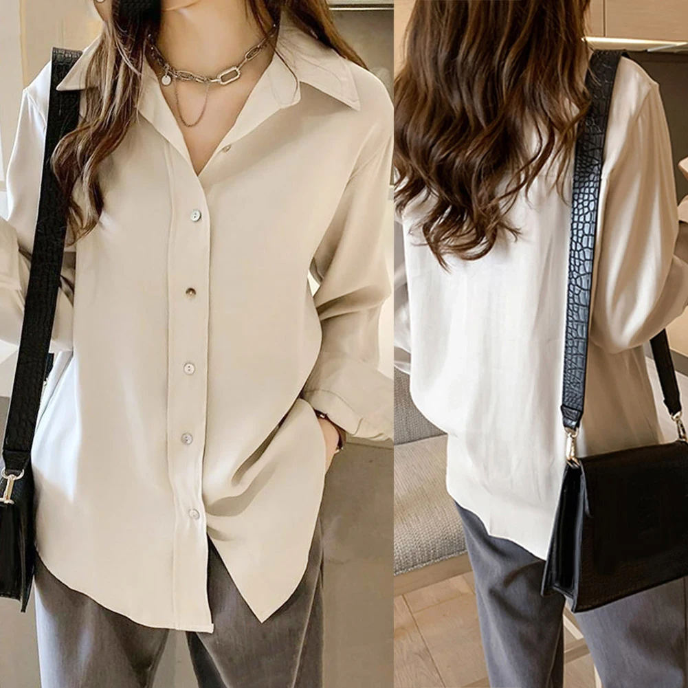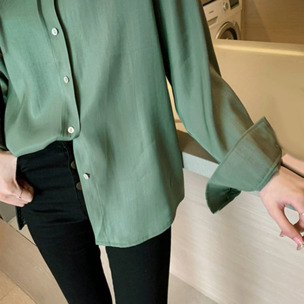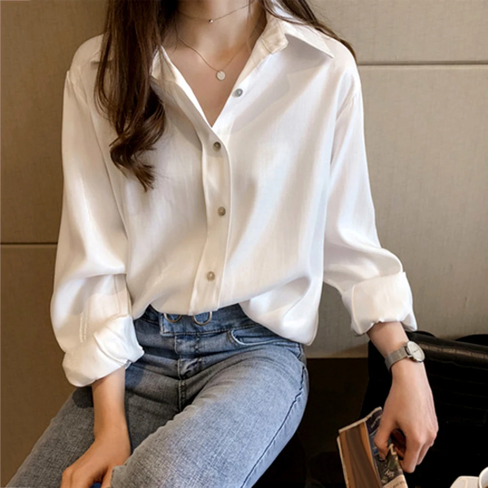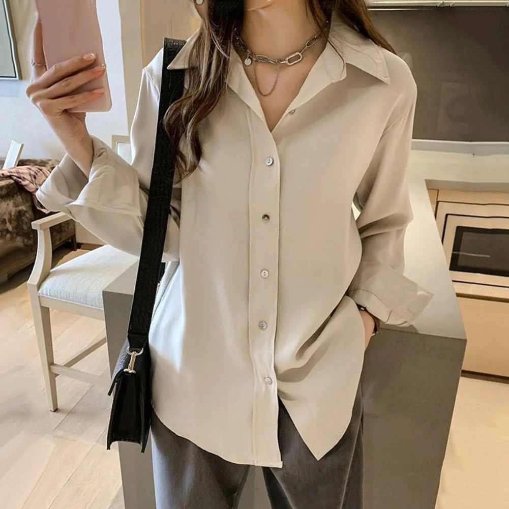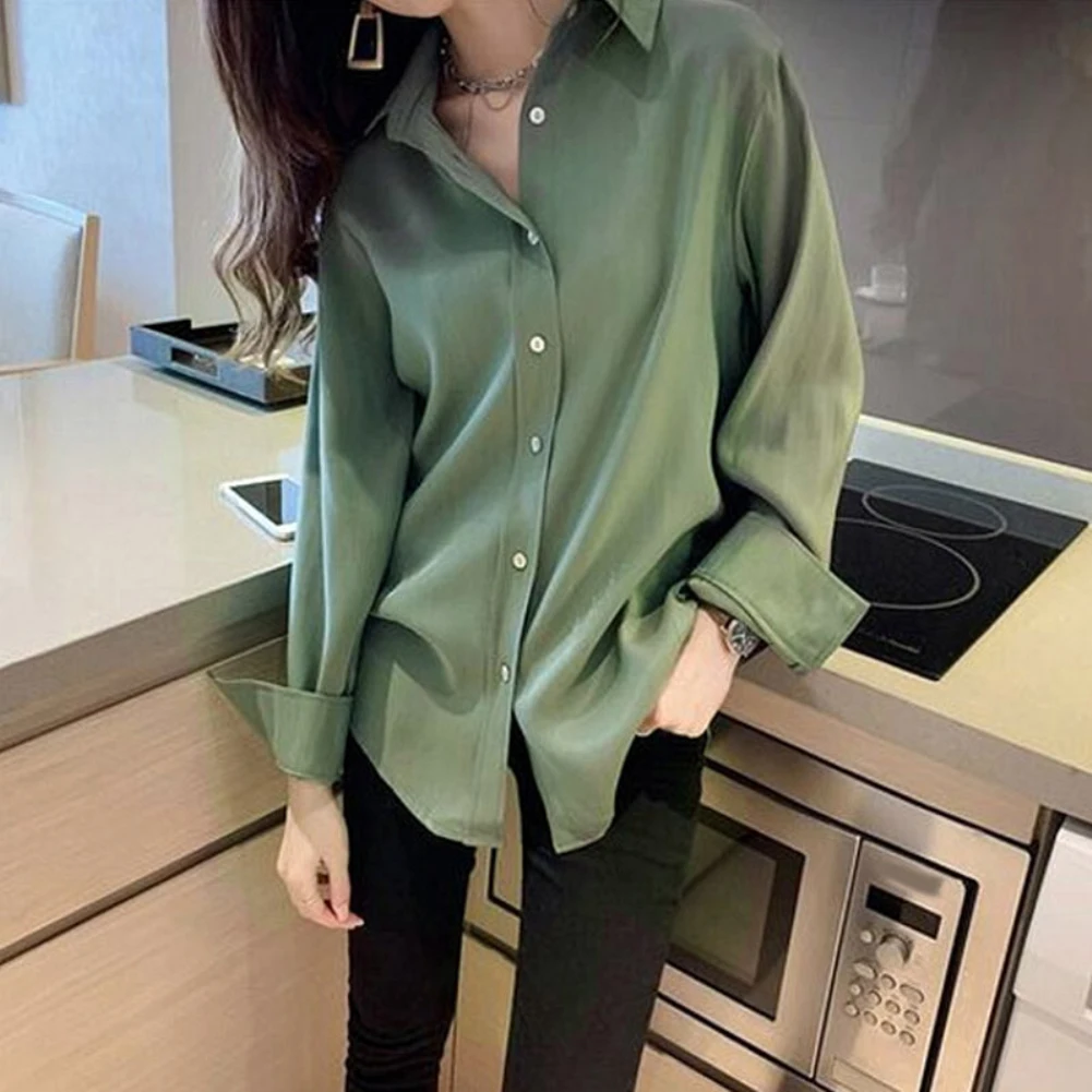 Женская однотонная свободная футболка Топ с длинным рукавом и отложным воротником на пуговицах