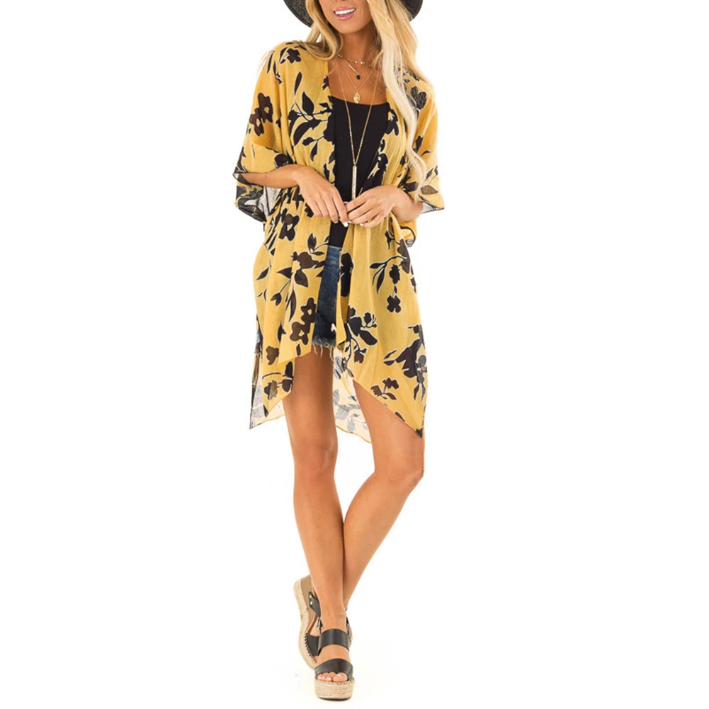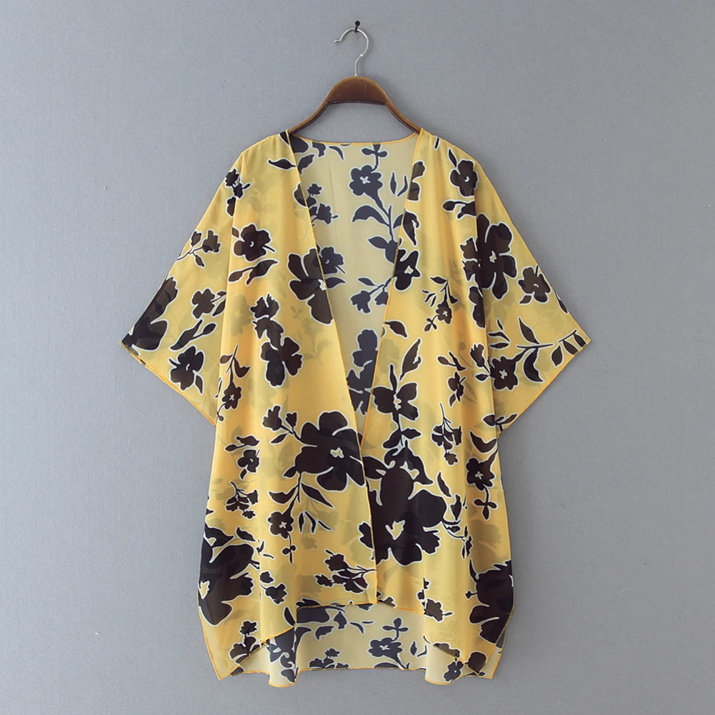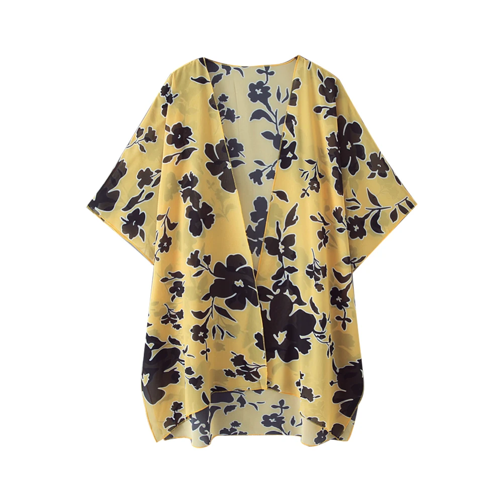Цветочный Женский шифон спереди открытый короткий рукав комбинезон кардиган с УФ-защитой блузка