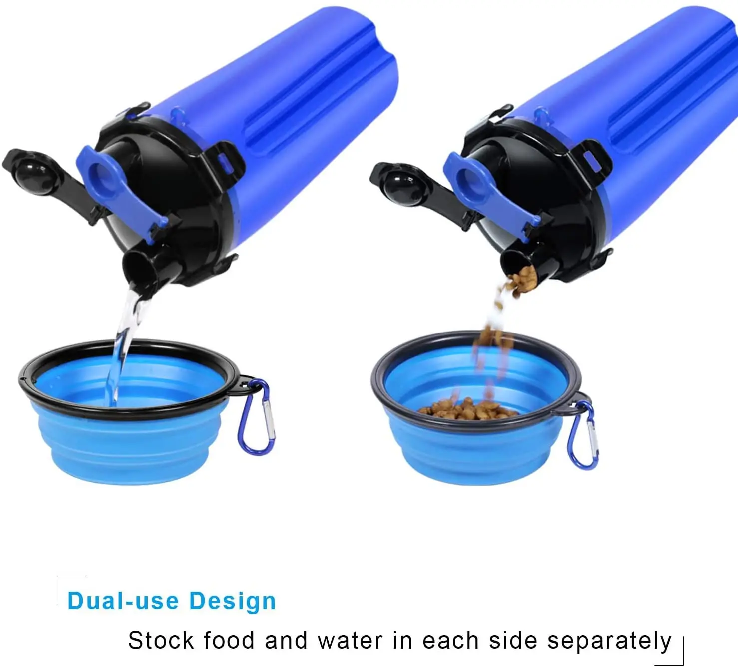 1. 2-в-1 собака бутылка для воды и корм для собак контейнер для хранения с двумя складные миски для собак, и два крючка на бутылку для свяжитесь с нами для того, чтобы повесить складная чаша.