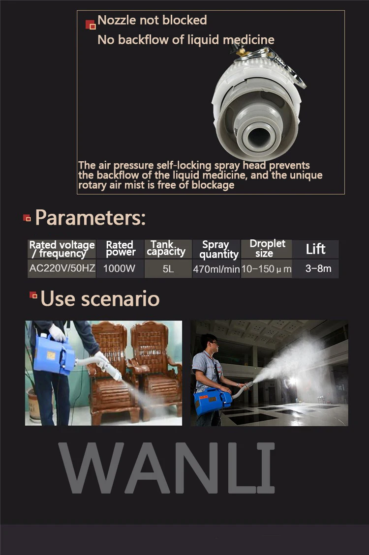 Номинальное напряжение: 220 В Номинальная частота: 50 Гц Номинальная мощность: 1000 Вт Емкость бака: 5л Объем распыления: 470 мл/мин. Размер капель: 10-150 мкм Подъем: 3-8 м Вес нетто: 2,35 кг Измерение: 560*240*320 мм Дисплей продукта:Способ эксплуатации и использования (3) После распыления жидкого лекарственного средства сначала удалите остаточное жидкое лекарство, затем добавьте прозрачную воду в медицинский бак, чтобы вымыть его и вылить, затем добавьте небольшое количество чистой воды, чтобы открыть большой поток, Распылите его в течение 30 секунд на пусковой колокольчик, чтобы предотвратить блокировку или коррозию сопла жидким лекарством. Отключите источник питания во время после использования и поместите устройство в безопасное положение, чтобы избежать брызг, ударов и прикосновений детей. Машина оснащена шнуром питания типа штепсельной вилки с фабрики. Пользователь должен проверить кнопку тестирования на штепсельной вилке для защиты от утечки перед каждым использованием, чтобы проверить, отключен ли источник питания автоматически; Если он отключен, нажмите кнопку сброса, чтобы сделать машину нормальной работой; если он отключен, замените шнур питания с защитой от утечки, Пользователь не должен менять «шнур питания типа защиты от утечки» на оригинальном продукте без разрешения. Меры предосторожности для использования 1. Прежде чем использовать спрей, подтвердите источник питания 220 В/50 Гц, подтвердите, что есть фильтр из хлопка и фильтр из хлопка не заблокирован. 2. Запрещено использовать высококоррозионную жидкую медицину. При добавлении жидкого лекарственного средства он должен быть меньше максимальной емкости 5л (как показано на рис. 1), чтобы избежать оттока жидкого лекарственного средства. Если в фильтрующем хлопке обнаружен поток воды, машина может быть запущена только после того, как она полностью высохнет. 3, чтобы обеспечить эффект распыления, диапазон скорости двигателя был ограничен во время производства. Не снимайте движение. Использование водорастворимого раствора не требует примесей для предотвращения закупорки труб. 4. В процессе эксплуатации следует немедленно отрезать: спрей находится в воде или выходит из нее; Вентилятор неожиданно прекращает работу: звук вентилятора, очевидно, меняется; утечка жидкости; Когда вентилятор выключен, Вентилятор не поворачивается и другие, очевидно, опасные условия. 5. После распыления добавьте небольшое количество чистой воды в медицинский бак для распыления, чтобы предотвратить блокировку или коррозию сопла. После использования источник питания должен быть отключен вовремя, чтобы очистить коробку для лекарств, и устройство должно быть помещено в безопасное положение, чтобы избежать брызг, ударов и прикосновений детей. 6, не используйте эту машину под дождем, строго запрещайте Использование влажной руки «plug», «pull» power plug, спрей должен быть далеко от горючих, взрывоопасных, места высокой температуры: не вытягивайте провода, предотвращая острые края, чтобы отрезать поверхность кабеля; Не включайте устройство часто, чтобы не повредить двигатель. 7. Чехол-книжка. Мощность должна быть отключена. Свяжитесь с нашей компанией. Не профессионалы строго запрещают демонтаж, ремонт или замену продукта, особенно линия питания типа вилки с защитой от утечки, чтобы избежать опасности. Удовле